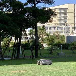 県警と県庁の間の芝生でラジコンカーが動き回ってます!! てっきり 警察官が爆発物を取り除く 訓練を遠隔で やってると思ったら 😳自動芝刈機ですって🚙🍃✂️ あきさみよぉ~😆びっくりぃ