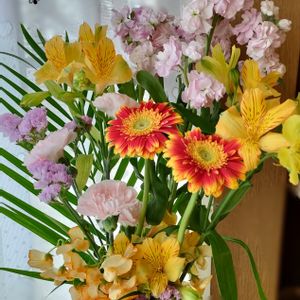 戴き物の花束💐 先週主人の勤務先でまた式典があり 分けて貰った式場装花がうちに来ました❣️ 私が選ばないような色の組み合わせが とても新鮮です。😃 特にこのデーハーなガーベラ!😆 ガーベラというと可憐なイメージだけど これは元気貰えそうな感じですね❣️ 新年度のスタートに相応しい花束です。 私ならここにブルー入れたくなっちゃう。 それだとガチャガチャしちゃいますかね。 ╮(^▽^)╭ 🏷ビューティフル サンデー 🏷日曜日ビタミンカラー♪ 🏷ニコニコ日曜日 参加させて下さい。🥰