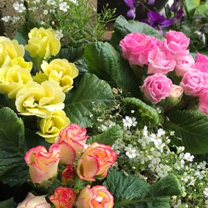 プリムラ・ジュリアン バラ咲きの可愛いお花は 気持ちも明るくしてくれますね💗💛 かすみ草ジプシーはこぼれ種さんで 寄せ植えをふんわりまとめてくれますね🤍 サンキュー(*˘︶˘*).。.:*♡