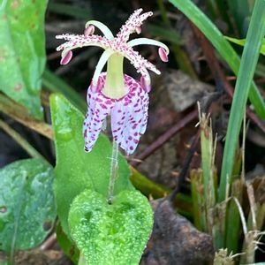 山杜鵑 ヤマホトトギス ユリ科 ホトトギス属 分布 北海道南西部 本州の岩手県以南 四国 九州 花期 8〜10月 まだ見ぬヤマホトトギスに出会えたと喜びましたが雄蕊の花糸の基部に斑点がありません。調べましたら ないものもあるとのことでヤマホトトギスとしました。