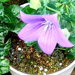 桔梗が咲きましたが。周りがスミレの葉に囲まれて少しおかしな感じになっています。