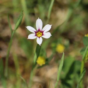 《ニワゼキショウ》アヤメ科ニワゼキショウ属 雄シベは写真の様に3つに分かれ、下部分で一つになっており、 その中央には同じく、小さな3股に分かれた雌シベが、カップ🥤のように雄シベに巻かれて隠れています。 北アメリカ原産の雑草が、外来種として、雑草化。