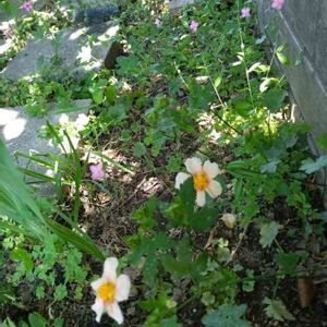 ここは木陰で居心地サイコーゾーン。 勝手にみんな侵食し、居心地良さそーに共存共栄。 今はマルバストラムと、オシロイバナと、オルラヤと、オギザリス?が勝手にさいてます。、背の高いグラジオラスまで、グングン生育。 ここ、通路の真ん中ですがー。😅