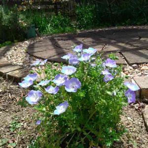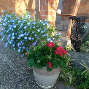 玄関にネモフィラ。垂れ下がってはいるけど、あふれんばかり✌ これから花を付ける赤花と、ソロソロ交代かな。