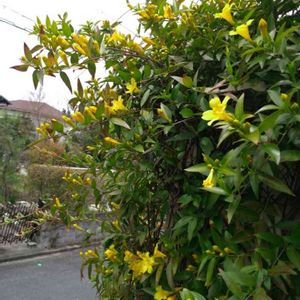 カロライナジャスミンがいっぱい咲き始めた! イナバ物置の目隠しに植えました。