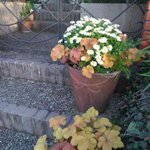 ヒューケラと、スノーポールの寄せ植え。 ビーズくん、さりげなく写ってるね😄