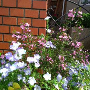 蕾の時期が長かったボロニアがやっと開花。 待ちくたびれてネモフィラが徒長してます。