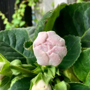 グロキシニア 去年見つけた見切り品です かわいいピンクの花が咲いて大喜びしたけど 花は2つでもう蕾はなし 葉っぱは色が悪くて茎も弱々しい がんばって~🙏