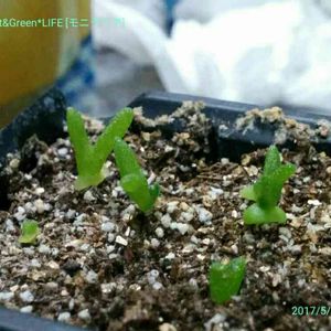 モニラリア 実生。 腰水はもう止めてるんだけど、大丈夫なのか心配。 でもひとつ溶けちゃったから、少しずつ乾かし気味管理へ移行した。 夜に霧吹きしている。 そしたらなんか出てきてる。 なんの芽!?