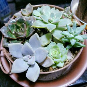 秋のもりもり多肉丼! 衝動買いしすぎたのでひとまとめにしました(:3_ヽ)_ 後ろにこっそり写ってるのは溢れたやつ( ˇωˇ ) ひとつ、エケベリアの名前で売られてた子がいました。なんて名前だろう?