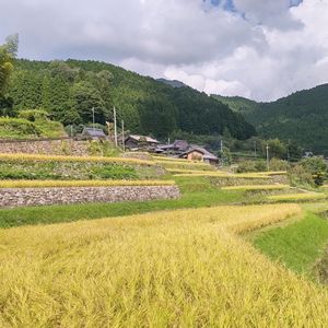 日本棚田百選にも選ばれた美しい石積みの棚田、 岩座神の棚田💛💚 鎌倉時代から続くと伝えられ、反り返りの美しい「寺勾配」の石積みで造られているのが特徴です。 今年は黄金色に実った 景色を見ることができました😊