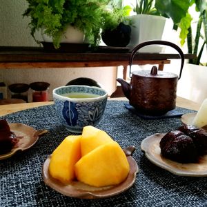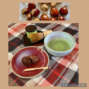 遅ればせながら… 花街urawaさんの秋の茶会に 参加します🍵 梨 栗の渋皮煮 柿 羊羹 (ドライイチジク、クルミ、杏、シナモン、コリアンダー入り) 今日はお煎茶ですっきりと✨ 秋の恵みのオンパレードです🌾
