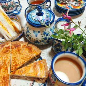 秋も深まる今日この頃 暖かいお茶が恋しくなります。 紅茶の産地では 今年最後の収穫が いま時分ですね。 私は基本 紅茶はブラックティー 何も入れないのが好みですが 本日は こしらえたお菓子に 合わせてミルクティー 茶葉はミルクに負けないものを。 銘柄に拘りはありませんが アッサム ウバ ダージリン オータムナル あたりが有名ですね。 お菓子はスイスの銘菓 東部グラウビュンデン州 エンガディン地方のお菓子です。 秋になると作りたくなります。 タルト生地にクルミの入った キャラメルを入れて また タルト生地で蓋をして 焼き上げます。 味はバターでキマリます なんて 昔なにかのCMの キャッチコピーに ありましたね。 私がお菓子をつくる時 バターは譲れないものは マドレーヌとタルト ほかでの代用はしません 笑 焼いている時はもちろん 日数をおいてからも 香りと味はバターならでは。 濃厚なお菓子ですから それにタイはる しっかりとした味の紅茶 ミルクととても合います。 普段 お菓子のup!は 3時頃にしていますが 本日はお昼どきに✨ なぜなら紅茶はカフェインを 含み 3時をまわる頃に あまり摂取すると 夜間の寝つきが悪くなる方も いらっしゃるのでは? と思うからです。 ただでさえ 濃いめに 淹れますからね。 お昼の軽食にサンドイッチを 用意して バイカラーの チェリーセージを添えました。 お茶やお菓子をいただきながら いつもより長めのお茶の時間 ゆっくりとお話しましょう。 花街urawaさんの秋のお茶会に 参加させていただきました。