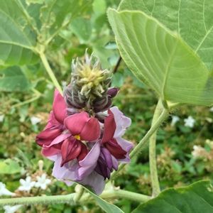 線路に沿って続くフェンスに絡まって生えているクズ。 遠目には見えなかったのですが、近づくと葉っぱに隠れて花が咲いていました‼️ 足下が草ぼうぼうなので🐍さんにビクビクしながら、我慢して撮りました😅💦💦