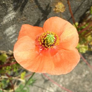 お散歩の途中、ナガミヒナゲシに出会いました。 花壇と道路の隙間に並んで咲いていました❗️ 黒い紋のついているのもあるらしいですが、ここにはありませんでした💞