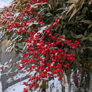 南天 散歩道、目に飛び込んでくるのは南天の実の赤。 他の花たちにはなかなか会えません。 2025.2.13.朝