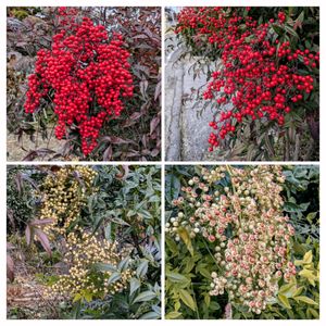 南天 (赤、白) この時期散歩道で暖かさを感じさせてくれるのは真っ赤な南天の実、傍らで白(黄色)も…。 2025.1.2、瞽女撮影