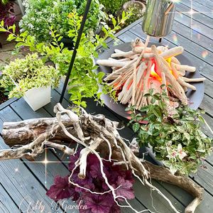 流木アレンジpart2 川と海では、雰囲気が違うでしょ? ⬇️もうひとつの流木アレンジなんだけど🤔根っこの繊細さが気に入ってるのよね でも、アレンジが難しかったわ(*'▽'*)♪ 長〜い、ハートカズラを合わせてみたりしたけれど。。なんか変なのよ(;´∀`) 今度、多肉ちゃんか、エアープランツを試してみるね🎵( *´꒳`*) ↗️海の流木アレンジ(夫の遊んだ😁) 焚き火🔥台に乗せた流木が燃えてるみたいでしょ?3色のセロファンと電気💡🤍 サーモスタットを仕込んであるので、薄暗さを感じてから6時間点灯します🤣😎