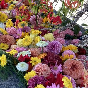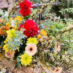 こんばんゎ🌃🌕✩.*˚ ☀幾分、暖かい日です8℃ ⛩金蛇水神社 🌸花手水(ダリア、キク、ガーベラ、カーネーション) 雪吊り、藁ぼっちの中は牡丹、さすがに咲いてませんでした💦 5月のぼたん祭りまでは、見れません(^-^;