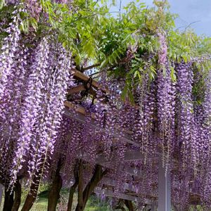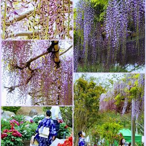 金蛇水神社2枚目 藤棚の💗紅藤、💜紫藤 和服姿の女性、眺める姿が美しい👘✨🌌