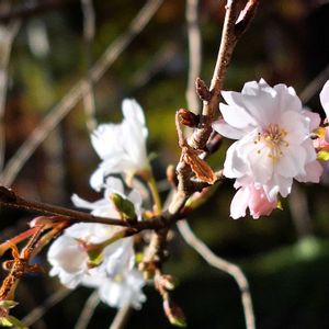 フユザクラ(冬桜)二種 ①②ジュウガツザクラ(十月桜) バラ科サクラ属 花期は4月 と10〜12月の二度咲き コヒガンザクラなどのヒガンザクラ系の園芸種 全体の蕾の3分の1が10月頃から咲き(ピークは11月)、残りの3分の2は春に咲く。 花弁は白またはうすピンクの八重である。 ③④コブクザクラ(小福桜) バラ科サクラ属 十月桜と同様に秋から冬と春の年2回咲く。 花は八重で花びらの数は20枚以上で多い。 ふつう、1つの花からは1つの実ができるが、この子福桜は2つ以上の実を付ける。 そこから「子宝」の桜ということで「子福桜」の名前になった。