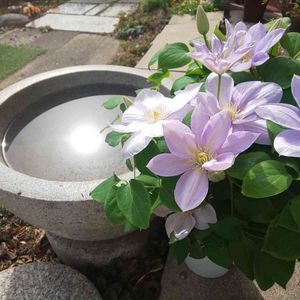 石の日に お邪魔します うちの石臼 おばぁちゃんがいた頃はこれで餅つきしてました。 今は小鳥が水浴びにやってきます🐦️ 祖母が好きだったクレマチスをお迎えしました💜