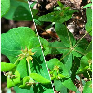 ナツトウダイ トウダイグサ科トウダイグサ属 菜種油を入れた皿に芯を入れ、明りとする灯明に花の形が似、花期が夏というのが名前の由来だが、花期は長く春~夏 有毒植物で、切ると白い汁が出る。 💚野山の草地に生える。 草丈20〜40センチで、茎が紅紫色を帯びている。 葉は長い楕円形で互生。茎の先に4〜5枚の葉が輪生し、葉腋から出た枝の先端に2枚の三角形の苞葉に抱かれた花序を付ける。 トウダイグサ属の花は杯状花序という構造で、総苞片が5枚合わさってつぼ形になり、その中に雄しべだけの雄花が数個、雌しべだけの雌花が1個入っている。 花序の外縁部に蜜を出す腺体があり、本種の腺体は紅紫色で両端が尖っているのが特徴。 言葉だけの説明では、とても分かりにくいですね😰 上のpicが総苞が少し広がっている様子が伺えます。 これから咲き進んでいく途中ですね。 もう今頃は特徴がはっきり分かる様になっているでしょうかね💚🎶