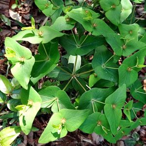 葉の付け根より茎が5本伸びた先の三角形の葉の基に小さい花をつけています。 ナツトウダイ(夏燈台)だと思います😃 枯れた茶色の杉の葉床の中に生えているので、緑色の葉が映えますね。