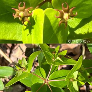 5/2 弥彦山 いつものナツトウダイなんだけど、コノ娘、違うネ。 💦💦💦🙇♂️🙇♂️🙇♂️💦💦💦 ⬆️⬅️ いつもの、ナツトウダイ(夏燈台)トウダイグサ科トウダイグサ属の多年草。三日月形の腺体が特徴、子房はなめらかで無毛、花期は春。 ➡️⬇️ではコノ娘は⁉️。全体は良く似ているけど、腺体は楕円形。あきらかに違う娘‼️。子房を確認できない事が残念。 タカトウダイ(高灯台)なのかナ〜。タカトウダイは、腺体は楕円形、子房はでこぼこがあり無毛、でも花期は夏です。ウ〜ン。他にも有るけど・・・ワカンネ〜ヤ。 💦💦💦🙇♂️🙇♂️🙇♂️💦💦💦 やがて、いつか、わかる事も有るでしょう。