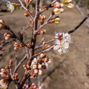 サクランボの交配用にナポレオンを植えたら良いよって言われてますが残念な事に他のサクランボは未だ開花してないので?挙句にナポレオンの交配樹が無い為か実付きが悪いんです〜友人宅の長寿梅の花色濃くないですか?茶色に近い色が珍しいのか今後に期待 春先の黄色の樹木から花色も変わり椎の木の芽吹きの金華山の様に山の色も変わりますね〜