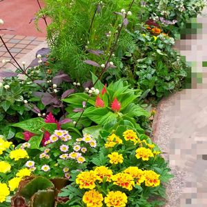 今日のお花 手前オレンジとイエローニ色 有楽町駅前ホテル🏨 寄植え花壇(♡ω♡ ) ~♪ 昨日の🤳より