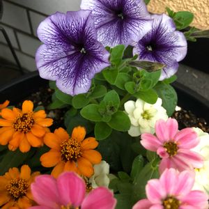 連休中にペチュニアとジニアの寄せ植えをしました。 ペチュニアは植え付ける時に花を切り戻したのがもう、咲き始めました🎶💕
