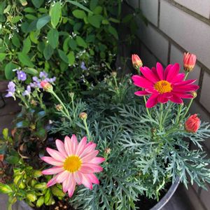 こんにちは😃 1/20に迎えて寄せ植えした斑入りブルーデージーとジュリアン、花かんざしがそれぞれ元気に咲いてくれてます❣️ いつもブルーデージーは夏場に枯れてしまうので今年は春には地植えして、日陰を作ってあげ秋まで咲いてくれるように頑張りまーす🤗