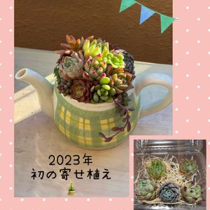 昨年末にポチった多肉弁当🍱 今日届いたよ💦((っ•ω•⊂))ウズウズ 急須セットの🫖に穴あけて、お家で育った多肉を集め、最後にルビネかグリネ悩み😅 出来上がり✨✨2023年初寄せ植え🎍 湯呑みもあるんだけどなぁ〜🤭穴あけるのが大変💦また今度😁