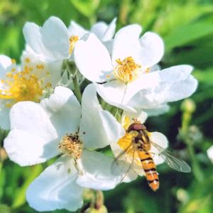 ナニワイバラの花に潜るハナムグリを 撮っていたら たまたま飛んでいた ハナアブも一緒に写り込んだよ
