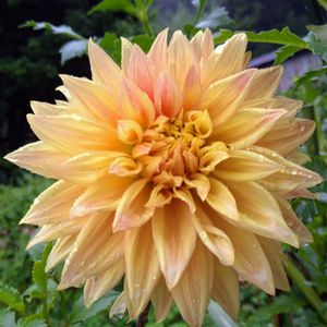 待ちに待った1番花🧡 黄色にオレンジがかった色が特徴のダリア・ボナベンチャー🤗 雲天でくすんでいるように見えるから、次の花が咲く頃には晴れて欲しいです🙏💓
