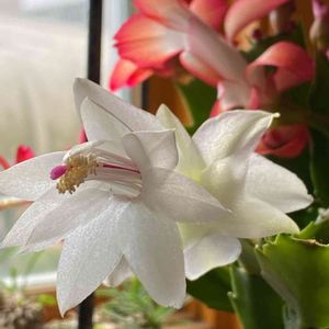先日スーパーのお花コーナーで見つけたシャコバサボテンの白が咲きました🤍❤️ 赤は先に咲き出してましたが、白は蕾でした。 以前、白と言いながら咲くとほんのりピンク色の時があったので疑ってました😁 今度は本当に真っ白です🤍😄