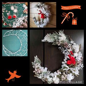 フラワーアレンジメント 手作りドライフラワーや100均で買った材料でクレセント型の大きめなアレンジ作りました~💦 まずは針金を三日月🌛の形に!! クロワッサンみたい😁 フェイクのリーフやプリザーブドフラワーのバラ、棉の実、シルバーブルニア(白い実)など、赤をアイポイントに落ち着いた雰囲気のアレンジが出来上がり~👍 でもまだ完成ではないのです😅 仕上げに⁉️ また見てくださいね🎵 玄関に飾ります😃 忙しいのにこんなことやってる私😅