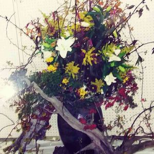 おはようございます☁️ 以前生けたものです。 大きな作品ですが購入した花材はユリだけ、あとは身近にある 物だけで仕上げました。 流生派 自由花🌿