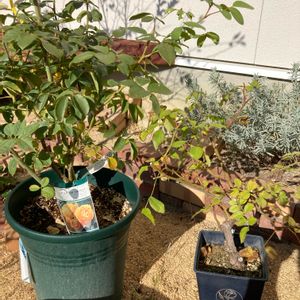 右:ザ レディオブザレイク🌸 ERのつるバラで、とっても気になってた子。コマツガーデンで訳ありセールだったので勢いで購入❣️ 来年の春の開花が楽しみだ〜🧡 左:グラハムトーマス 春に迎えた我が家初のイングリッシュローズ🌹 それはそれはもう‥感動的な美しいバラでした。 大株になるまでは秋は咲かないみたいだけど、ぶっといシュートが2本も出ていて力強さを感じます。