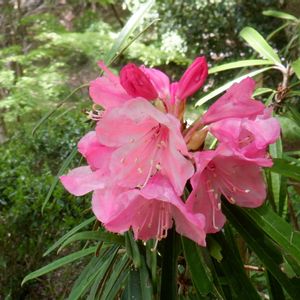 ホソバシャクナゲ(細葉石楠花) 別名:エンシュウシャクナゲ(遠州石楠花) 少し、花期が終わった花もありましたが、急な岩場に、自生とは思えないような華やかなホソバシャクナゲの花があちらこちらに咲いていました(’-’*)♪