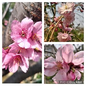 我が庭に咲いたサクラ。 ピンクが濃く鮮やかです。右上枝垂れ桜、下はアーモンドも開花宣言しました。