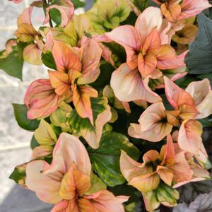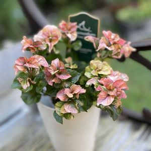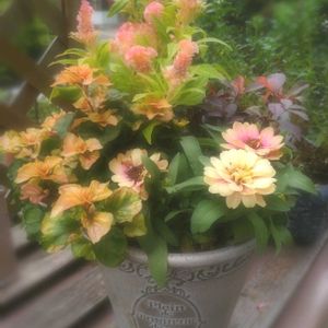 連投失礼します(⋆ᵕᴗᵕ⋆).+*ペコ 寄せ植えをもうひとつ(*´∀`)♪ 使用花材🌼🌿 ジニア・ジニュアンスダブルピーチテラコッタ🌼 セロシア・ジュラサーモン🌼 アルテルナンテラ・ファニードレス🌿 アルテルナンテラ・カメレオン🌿 ドラゴンの寄せ植えとは好対照にこちらは甘いテイストでお嬢様👸っぽい雰囲気に(*´ ˘ `*)♡エヘヘ