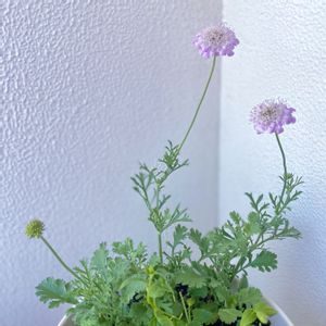 トレニアと寄せ植えしてある、スカビオサのピンクレースが咲き始めました。育てている、ハーレクイーンによく似た色ですが、ピンクレースの方が、青みが少なくて、柔らかいスモーキーなピンク。愛らしい姿ですが、40℃超えのベランダで逞しく咲いている強い子なんです。