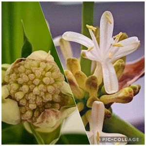 今日のお花・ドラセナ🌿 友達にプレゼント✨🎁✨した小ぶりのドラセナレモンライム🌱 半年後に蕾がついて♡昨年2月の写真です。お店をしている下駄箱の上に今も綺麗なグリーンで💚