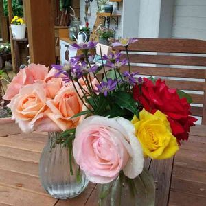 おはようございます✨ 昨日から雨が降っていて、全てがしっとりしています☔️ 写真はテラスのテーブルの切り花達🌻
