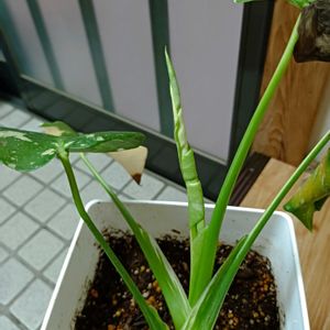 モンステラ 斑入り 2025/10/11撮影 油断して日に当てて、日焼けしちゃったモンちゃん… 新芽ドリルが出てきました😃😃 なんか、穴あいてるみたいでウキウキです😙