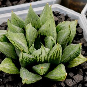 ●ススキノキ科 ツルボラン亜科 ●ハオルチア属 ●シルバーベル CS 1✕グラスソード 実生😻😻 GSのみくたさんからいただいた株なんですが、少し成長して鉢枠に当たってしまうので、土を鉢上まで上げて葉が鉢枠に当たらない様に植え替えしたんですが、この夏下葉が数枚やられまして…😅 それに、根が土から出ちゃってるのがあるので、春にはまた植え替えし直そうかと思います…😩😅😅