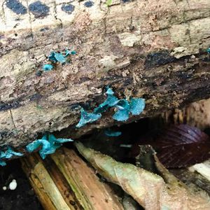 なんじゃこりゃーー😳💦 綺麗な青色💙 検索してみたところ、ロクショウグサレキンモドキ(擬緑青腐菌)っぽい🙄 森には不思議がいっぱい🤩🎶 追記:この青い色素で染め物ができるそうです😳
