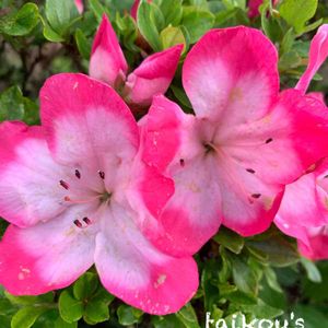 サツキ『天翠(てんすい)』 花芸の豊富な品種です。 白地に濃紅色と濃紫色の大小絞り、薄い紫色とトキ色の大小絞り、覆輪、底白と、白色、濃紫色、濃紅色、うすい紫色、トキ色の無地花が咲きます。